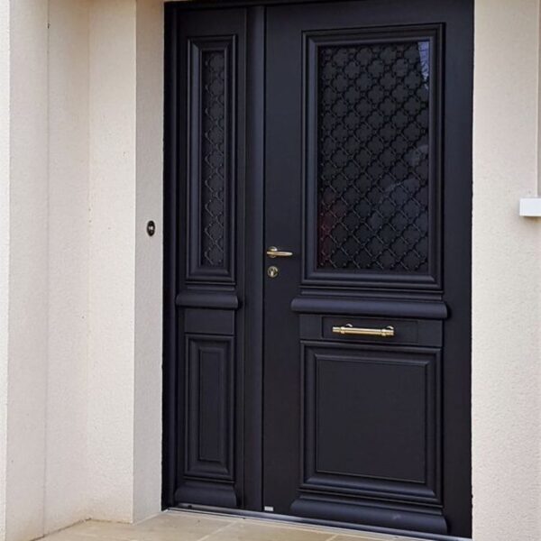 باب حديد دبل صاج ديكور مجنو مع ديكور صب الومنيوم او نحاس مع زجاج عاكس بالوسط